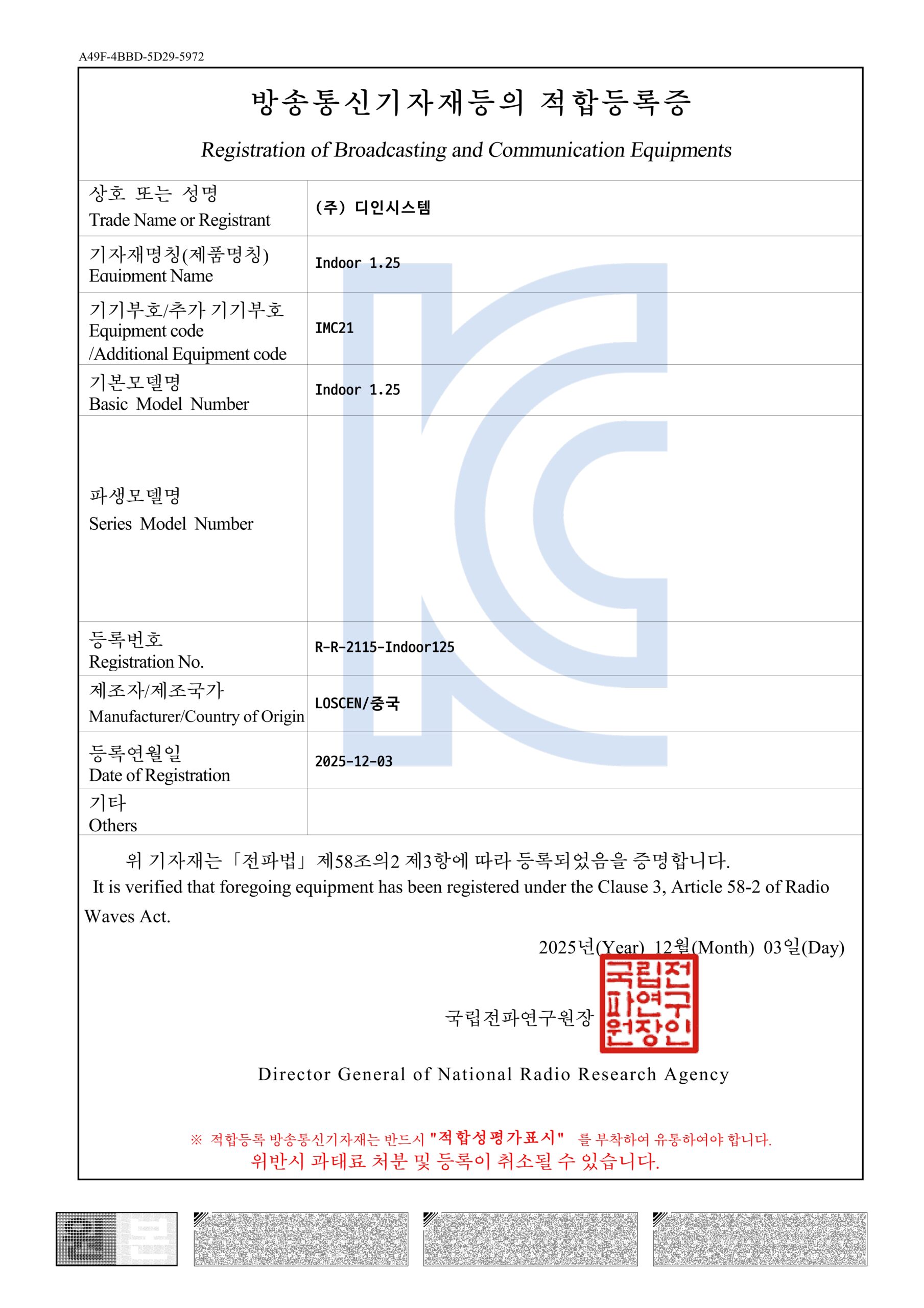 방송통신기자재등의 적합등록 필증
